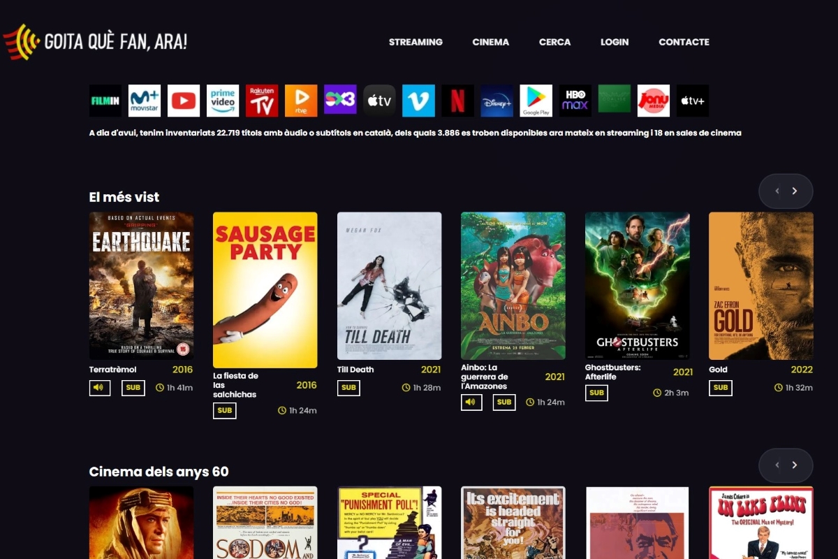 Ara fa més d’un any que naixia Goitaquefanara.cat, un portal que tenia l’objectiu de catalogar tot el contingut audiovisual en català que es podia troba a les plataformes d’streaming per tal que els usuaris poguessin consultar què es podia veure i on. També buscava la comoditat d’aquells que en fessin ús, de manera que permetia fer la cerca per categories en funció de si eren pel·lícules, sèries, obres de teatre o documentals. Per completar-ho, es podia triar el gènere o si l’espectador les volia veure subtitulades o doblades.