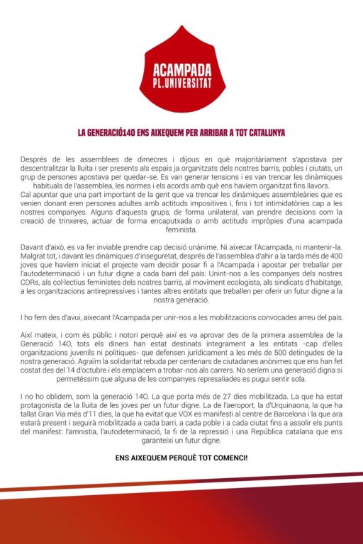 Els joves van iniciar l’acampada indefinida dimecres 30 d’octubre a la plaça Universitat per reclamar que “s’aturi de forma immediata la repressió”, l’amnistia dels líders independentistes i que el president del Govern central en funcions, Pedro Sánchez, s’assegui a negociar un referèndum.