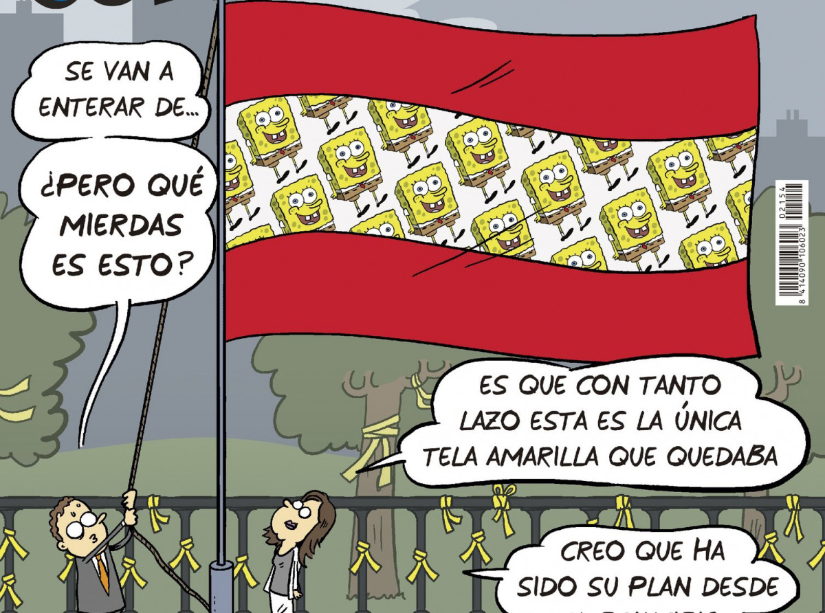 La portada de la famosa revista d’humor El Jueves, aquesta setmana fa mofa de la campanya contra els llaços grocs de Ciudadanos iniciada aquest estiu. Tal com es pot apreciar la franja groga de la bandera del Regne d’Espanya és substituïda pel popular ninot Bob Esponja. Els personatges justifiquen el canvi, ja que esgotada tota la tela groga, la de la bandera és l’única que queda per utilitzar. De fons es pot veure un paisatge ple de llaços grocs. La vinyeta es complementa amb la frase: ¿Quién vive en la finca debajo de Aznar? Una clara al·lusió a la cançó de presentació del ninot.