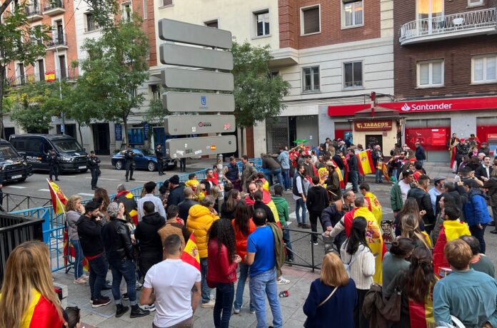 La convocatòria del PP s’ha acabat passades les 13.00 hores i un grup de participants ha decidit enfilar el camí cap a la seu del PSOE, on diàriament hi ha hagut protestes els passats nou dies. En el moment de màxima afluència, hi ha hagut prop de 3.000 persones a Ferraz, segons la delegació del govern espanyol, però cap a les 16.00 hores eren unes 300. S’hi ha sentit càntics contra el president espanyol en funcions, Pedro Sánchez, i desmarcant-se de la ultradreta: “No som fatxes, som espanyols”.