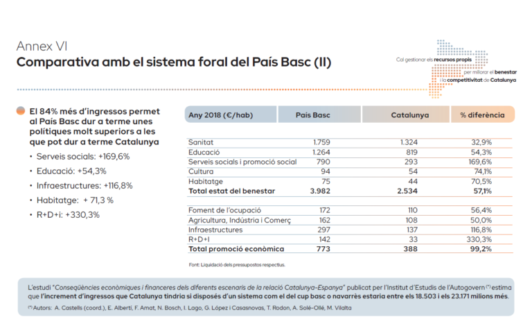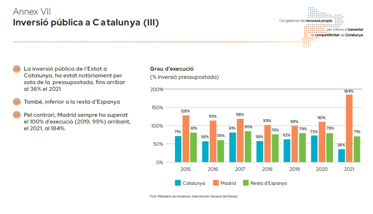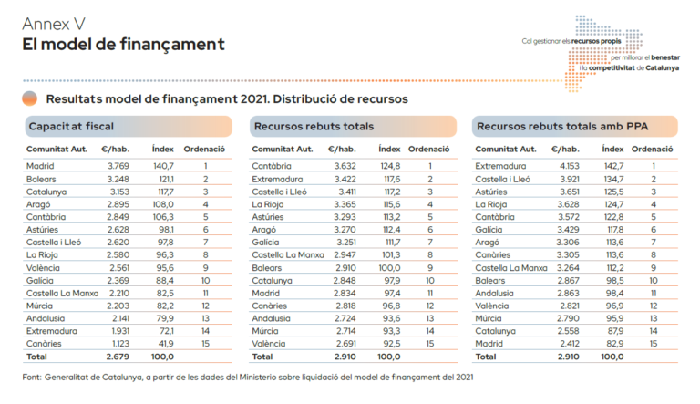 Denuncien que l’aportació “neta excessiva”a “la solidaritat i a l’equilibri territorial espanyol en relació al seu PIB afecta negativament al creixement de l’economia catalana”, així com al benestar i progrés dels ciutadans. Constaten també que el model de finançament, amb el qual es cobreixen els serveis bàsics de l’Estat de benestar, és “totalment insuficient per finançar les competències traspassades”, ja que “no ha seguit les exigències marcades per l’evolució de la població, i no garanteix ordinalitat”. Tal com exposen, Catalunya és el segon territori que més recapta i aporta, però salta al 10è lloc en fons redistributius, i al 14è tenint en compte el diferencial de preus.
