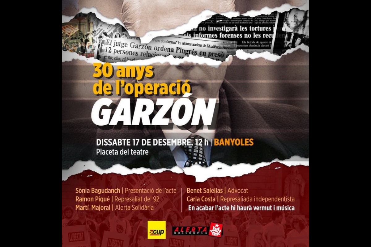 Es compleixen 30 anys de l’Operació Garzón, l’onada repressiva contra l’independentisme que va instigar el jutge de l’Audiència Nacional, Baltasar Garzón. Per evitar que aquest fosc episodi caigui a l’oblit, la CUP i Alerta Solidària han organitzat un acte popular a Banyoles el dissabte 17 de desembre.