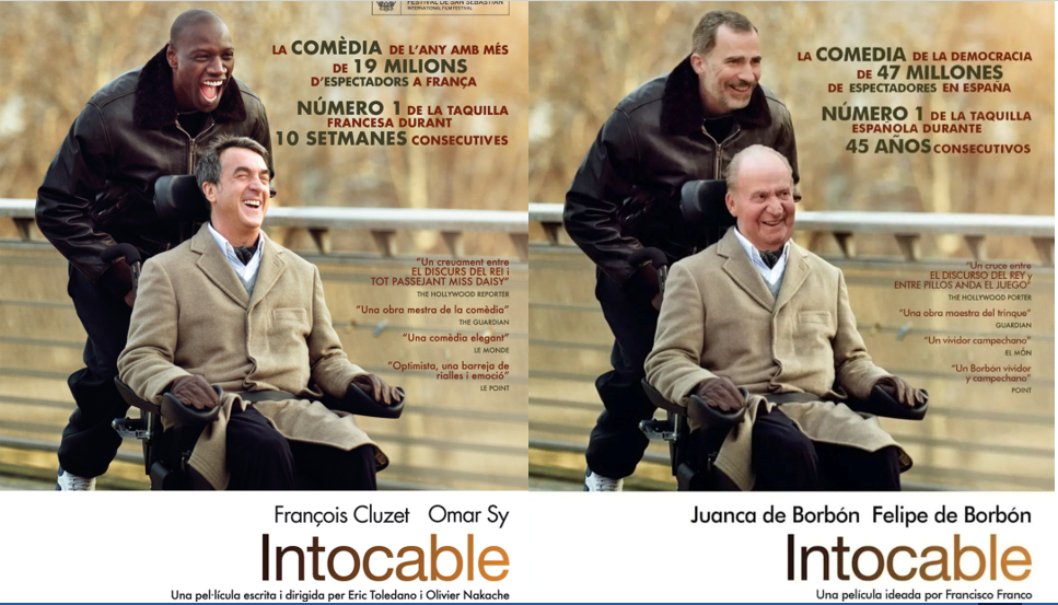 Desconeixem l’autor d’aquest muntatge visual que corre per les xarxes, però, “animus jocandi”, creiem que es mereix ser notícia dominical. A més d’estar impecablement ben fet, en tipologia, muntatge i qualitat d’imatges, el contingut és explícit i endevinat: convertir el cartell de la pel·lícula Intocable, un dels més grans èxits recents de la filmografia francesa, amb la comèdia borbònica. Els donem l’Òscar (i el Cèsar també) al millor muntatge.