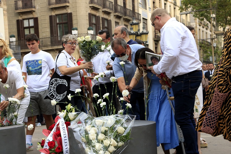 Barcelona ha homenatjat aquest dimecres les víctimes dels atemptats del 17 d’agost del 2017 en un acte de record al memorial al pla de l’Ós de la Rambla. Allà on va acabar el recorregut mortífer de la furgoneta fa cinc anys, víctimes i familiars han dipositat clavells blancs mentre una violoncelista interpretava ‘El cant dels ocells’. Els han seguit, des de segona línia, representants de les institucions, com el president de la Generalitat, Pere Aragonès; l’alcaldessa de Barcelona, Ada Colau; ministres del govern espanyol i la presidenta del Congrés, Meritxell Batet, i després membres dels cossos de seguretat i emergències.