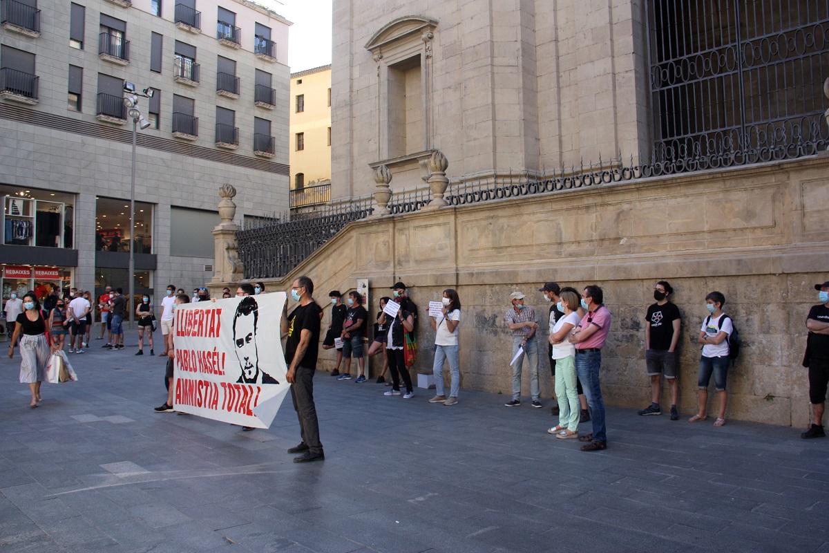 Prop d’una cinquantena de persones s’han concentrat davant l’edifici de la Catedral Nova de Lleida, en ple eix comercial, en contra de l’empresonament del raper lleidatà Pablo Hasel. Tot i que l’acció reivindicativa inicialment prevista era una manifestació, amb el confinament del Segrià s’ha mantingut de forma fixa en un mateix punt. Allà s’hi ha llegit un manifest en què asseguren que se li vol “imposar un càstig exemplar” que “podria comportar-li fins a quinze anys de presó”, tenint en compte que hi ha tres sentències condemnatòries que podrien fer, han afegit, que hi entri de forma imminent. A més, tant a través d’una pancarta com de les proclames dels assistents s’ha demanat la seva llibertat com que s’apliqui una “amnistia total”.