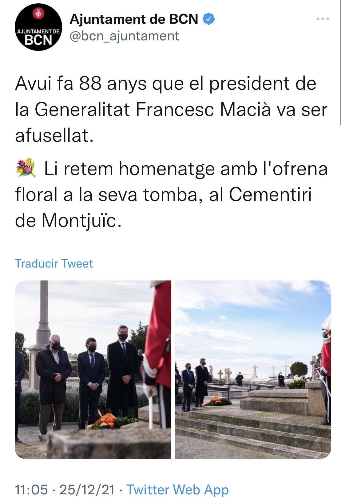 L’Ajuntament de Barcelona ha retirat aquest dissabte una piulada on, en el marc de l’ofrena tradicional a la tomba del president Francesc Macià, afirmava que el dirigent republicà havia estat afusellat. Macià va morir el 25 de desembre del 1933 en exercici del càrrec de president de la Generalitat, per al qual havia estat triat un any abans. La piulada original mostrava diverses fotografies dels membres del consistori en l’acte de l’ofrena floral. Les imatges anaven acompanyades del text “Avui fa 88 anys que el president de la Generalitat Francesc Macià va ser afusellat. Li retem homenatge amb l’ofrena floral a la seva tomba, al Cementiri de Montjuïc”.