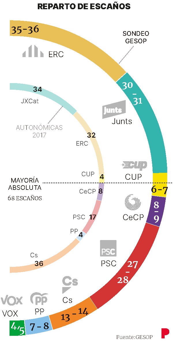 ERC obtindria 35-36 diputats i JxCat n’aconseguiria entre 30 i 31 a les pròximes eleccions del 14-F. Així ho indiquen els resultats d’una enquesta del ‘Periódico’, elaborada pel Gabinet d’Estudis Socials i Opinió Pública (GEOP). Per arribar, doncs, a la majoria absoluta caldria que els republicans pactessin amb JxCat i la CUP, que en aquesta enquesta sumaria entre 6 i 7 escons atorgant, doncs, una suma que oscil·laria entre 71 i 74. Una altra fórmula seria la unió d’ERC amb PSC i comuns, sumant entre 70 i 73 diputats. De fet, el document també revela que els socialistes podrien obtenir 27-28 escons, Cs cauria a 13-14 i VOX entraria al Parlament de Catalunya amb 4 o 5 diputats.