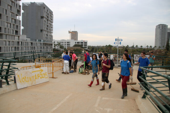 Les portaveus de les entitats han atès la premsa des de la passarel·la ciclopeatonal Lucía Bearmud, a València. Al llarg del pont han passat desenes de persones -la majoria jovent- que anava o tornava de pobles com Picanya i Paiporta.