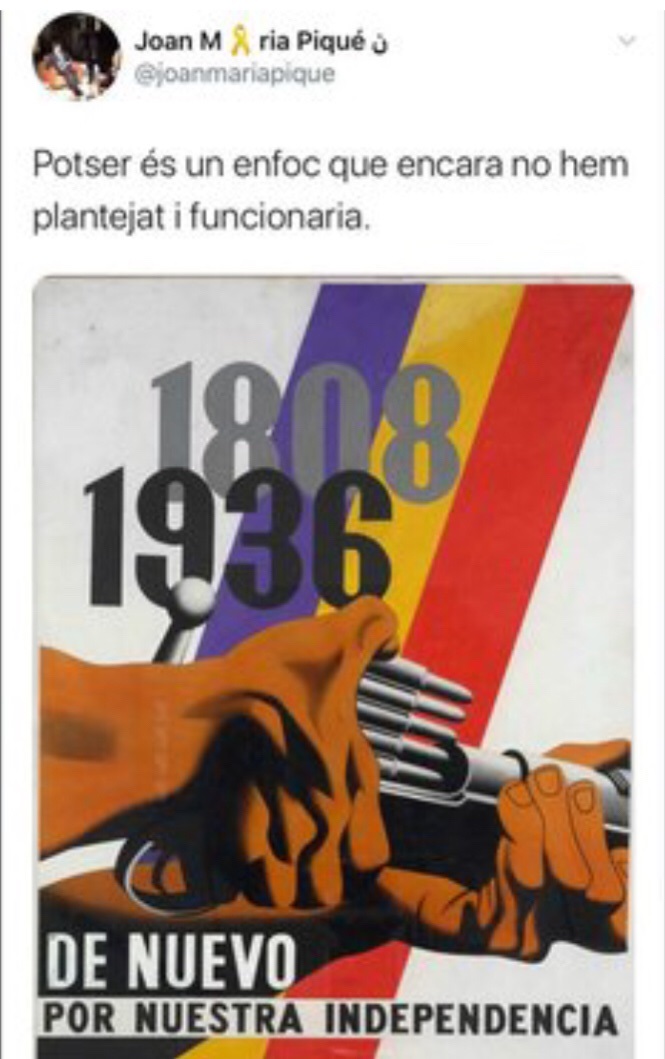 Al tuit, el director de comunicació hi incloïa un cartell de la Guerra Civil on apareixen unes mans amb un fusell i els anys 1808 –per l’Aixecament del dos de maig- i 1936 –per l’inici de la Guerra Civil-, amb el lema “Un altre cop, per la nostra independència”. Piqué l’acompanyava amb el missatge “potser és un enfocament que encara no hem plantejat i funcionaria”.
