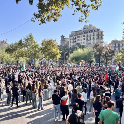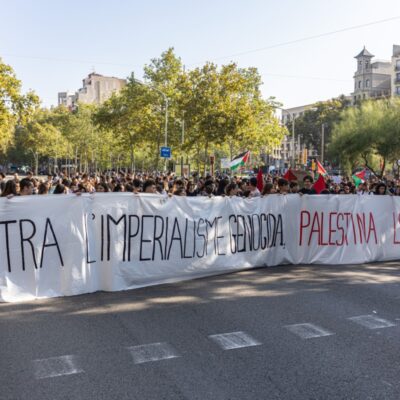 Centenars de persones arreu del país s’han mobilitzat aquest 15 d’octubre en el marc de la vaga general contra el genocidi d’Israel a Palestina. El país s’ha aixecat amb diverses vies tallades per piquets, i ha continuat mobilitzant-se amb marxes pacífiques celebrades a diversos pobles i ciutats. A Barcelona, els centenars de persones que han tallat la ronda Litoral al matí han arribat al centre per unir-se a la manifestació de plaça Universitat,; també a la capital, centenars de joves han tallat la Gran Via a l’altura del carrer Aribau, i han continuat amb una marxa pacífica fins a l’estació de Sants, on els Mossos d’Esquadra han carregat contra els manifestants per a dispersar-los després que un grup petit vandalitzés una cadena de menjar ràpid. A Girona, unes 400 persones s’han manifestat per tota la ciutat i han acabat tallant les vies de tren convencionals. Lleida també ha mobilitzat desenes de persones amb piquets i marxes cíviques. Les mobilitzacions continuen en altres punts del país, com ara a Mataró, on els manifestants han vaga han tallat una estona l’N-II i ocupat un McDonald’s, o a Manresa, on desenes de persones han bloquejat els accessos el Nou Congost per impedir la celebració del partit de bàsquet entre l’equip manresà Baxi i l’israelià Hapoel Jerusalem.