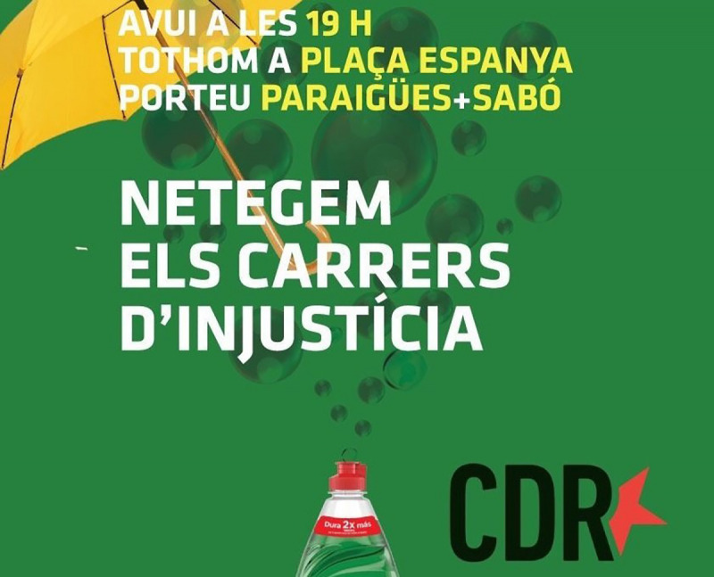 El CDR del Barcelonès ha convocat aquest dimarts a les 19 hores una protesta a la plaça Espanya de Barcelona amb el lema ‘Netegem els carrers d’injustícia’. En una anotació de Twitter, el CDR ha demanat als assistents que portin un paraigua perquè plourà i sabó “per netejar-ho tot”. “Pels més de 100 anys de condemna i més de 40 preses. Per la repressió del Règim del 78. Per la violència policial”, ha assenyalat el CDR.