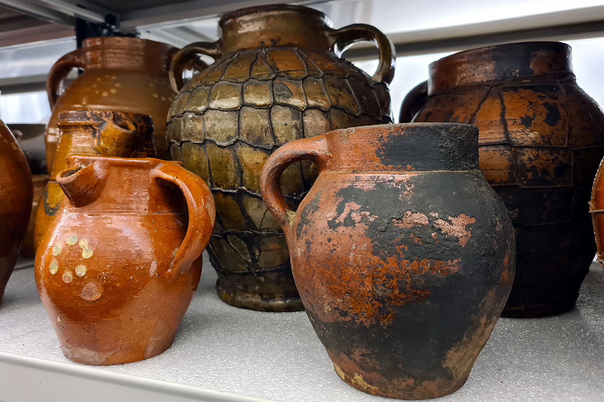 Al fons de l’Ecomuseu tenen una gran quantitat de peces de ceràmica: tupins, olles, plats, safates, orinals o curioses peces que s’utilitzaven per donar aigua a les persones malaltes. Gràcies a l’obra de Violant i Simorra poden referenciar moltes d’aquestes peces, des del nom que tenen fins al taller d’on van ser elaborades.