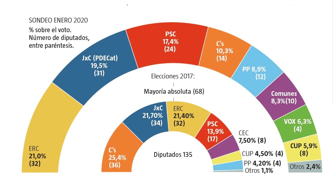 Ciudadanos (14) té una forta davallada que afavoreix PSC (24) i PP (12), lamentablement una altre enquesta confirma l’entrada de l’extrema dreta de Vox (4) al Parlament de Catalunya.