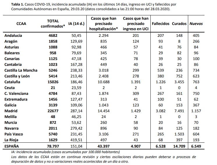 Malgrat tot, l’expansió segueix a un ritme molt fort. La regió de Madrid té fins avui, el 48% dels morts de tot l’estat i el 30% dels ingressat a l’UCI. Amb dades de tots els Països Catalans (Catalunya, País Valencià i Illes) són encara menys i avui estabilitzades, les dades són: un 23,31% dels morts, el 36% dels ingressats a l’UCI i el 29% dels hospitalitzats