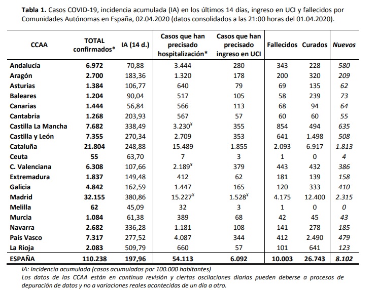 Malgrat tot, l’expansió segueix a un ritme molt fort. La regió de Madrid té fins avui, el 42% dels morts de tot l’estat. Amb dades de tots els Països Catalans (Catalunya, País Valencià i Illes) són encara menys i avui estabilitzades, les dades són: un 25% dels morts, el 38% dels ingressats. Una dada que fa sospitar d’algunes dades oficials, Madrid malgrat tenir molts més infectats que Catalunya, té menys ingressats a l’UCI amb diferència.
