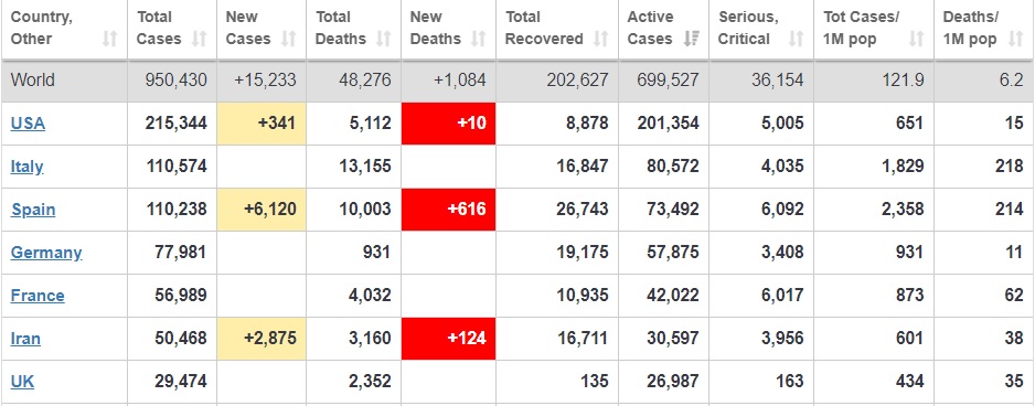 L’Estat Espanyol ja és el segon país en numero de morts, la llista l’encapçala ara Itàlia amb 13.155 ahir 12.428, seguida de l’Estat Espanyol amb 10.003 ahir 9.053, els EUA ja superen a la Xina amb 5.112 ahir 4.056, França també amb 4.032 ahir 3.623 i segueix la Xina amb 3.318 ahir 3.312. Destaca el comportament d’Alemanya amb 931 ahir 788 morts, i sobretot Corea amb 169 ahir 165 morts.