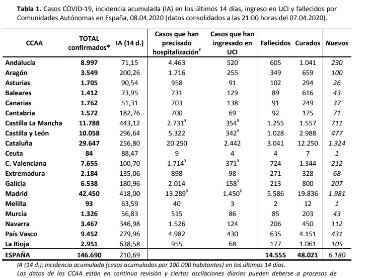 40.469 (ahir 38.273), són els casos de la regió de Madrid amb un 418, ahir 422, el primer dia que baixa, d’infectats sobre els darrers 14 dies amb 1.450 (ahir 1.494) ingressats a l’UCI i 5.586, ahir 5.371 morts. Madrid ha superat el nombre de morts que ha tingut la Xina en tota la pandèmia si les seves dades són certes. Catalunya té 29.647(ahir 28.323) infectats, amb una taxa sobre els 14 darrers dies de 256, ahir 266(per tercer cop baixa aquesta taxa). Sorprenentment Catalunya amb menys hospitalitzats té cada cop més ingressats a l’UCI que Madrid amb molts més casos.