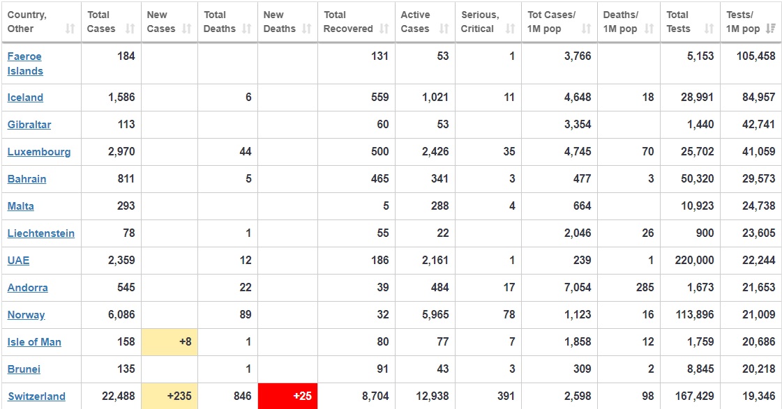A més tests i fets al principi menys infectats i molts menys mort, la llista és espectacular, països com Noruega, Suïssa, Eslovènia o Corea ho han demostrat, fins i tot Itàlia tard, augmenta dia a dia el nombre de tests amb una taxa del 12,45, mentre l’Estat Espanyol segueix amb un 7,6, Mireu les dades.