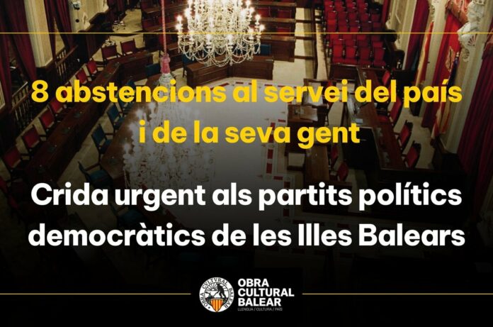 L’Obra Cultural Balear (OCB) ha fet una crida urgent “als partits democràtics i a la societat de les Illes Balears” per demanar una abstenció general que eviti un possible govern del PP amb Vox.