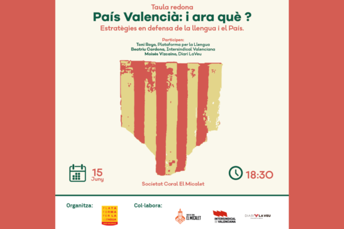 Plataforma per la Llengua ha convocat una taula rodona per abordar els reptes en la defensa de la llengua ara que el govern de PP i Vox és una realitat al País Valencià. A l’activitat hi participaran Antoni Royo, de Plataforma per la Llengua; Beatriu Cardona, de l’STEPV; i Moisés Vizcaíno, editor del Diari La Veu; que es reuniran a la Biblioteca de la Societat Coral El Micalet (València) aquest dijous 15 de juny. El moderador de la taula rodona serà el periodista Sebastià Carratalà.