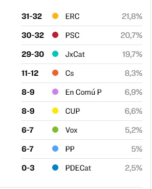 ERC guanyaria el 14-F quasi empatat amb el PSC i JxCat. Ho indica una enquesta publicada al diari ‘Ara’, que atorga la victòria als republicans que obtindrien entre 31 i 32 diputats. Els seguirien de ben a prop les formacions del PSC, que n’obtindrien entre 30 i 32 i JxCat, que se situaria en tercera posició amb 29-30 escons. Tenint en compte que la majoria absoluta s’assoleix amb 68 diputats, el partit encapçalat per Pere Aragonès s’hauria d’entendre amb JxCat i la CUP – la qual obtindria entre 8 i 9 escons – per poder garantir una majoria independentista al Parlament.