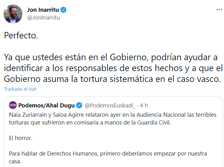 El Gobierno “més progressista” no para de quedar-se a la superfície, especialment pel que fa al bàndol de Podemos: Denuncia injustícies, però no les lluita malgrat ser al poder. Una nova evidència han estat les declaracions dels advocats torturats el 2010 per la Guàrdia Civil per vincular-los directament amb ETA per representar alguns dels seus presos. Després d’uns relats esgarrifosos, la formació morada del País Basc parla d'”horror”, assegurant que “per parlar de Drets Humans, primer hauríem de començar per casa nostra”, una afirmació que comparteix el diputat del Congreso per Bildu, Jon Iñarritu, però que ho ha aprofitat per llençar una crítica a UP.