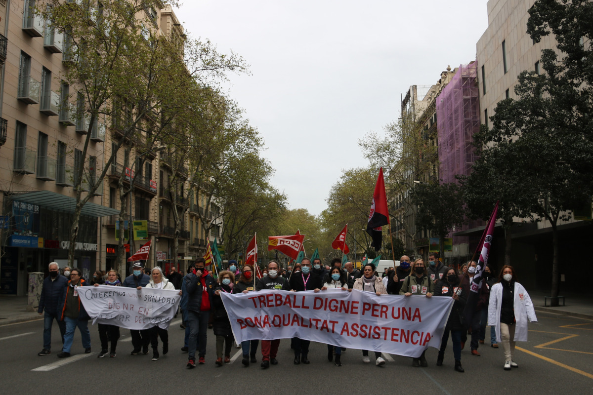 Centenars de persones s’han manifestat aquest diumenge a Barcelona per reclamar més inversió en sanitat i un sistema 100% públic. La protesta ha començat amb dues columnes separades que han sortit de la Ronda de Sant Pere i plaça Universitat, respectivament, per acabar trobant-se a la plaça de Catalunya. Els protestants reclamen arribar al 25% de inversió en atenció primària, millorar les condicions laborals, revertir les retallades que es van fer fa una dècada i recuperar tot el que s’ha perdut per la pandèmia. ‘Volem, volem, volem el 25%’ i ‘Sense nosaltres no hi ha salut’ són algunes de les proclames que han cantat els manifestants, entre els que hi havia professionals sanitaris i usuaris.