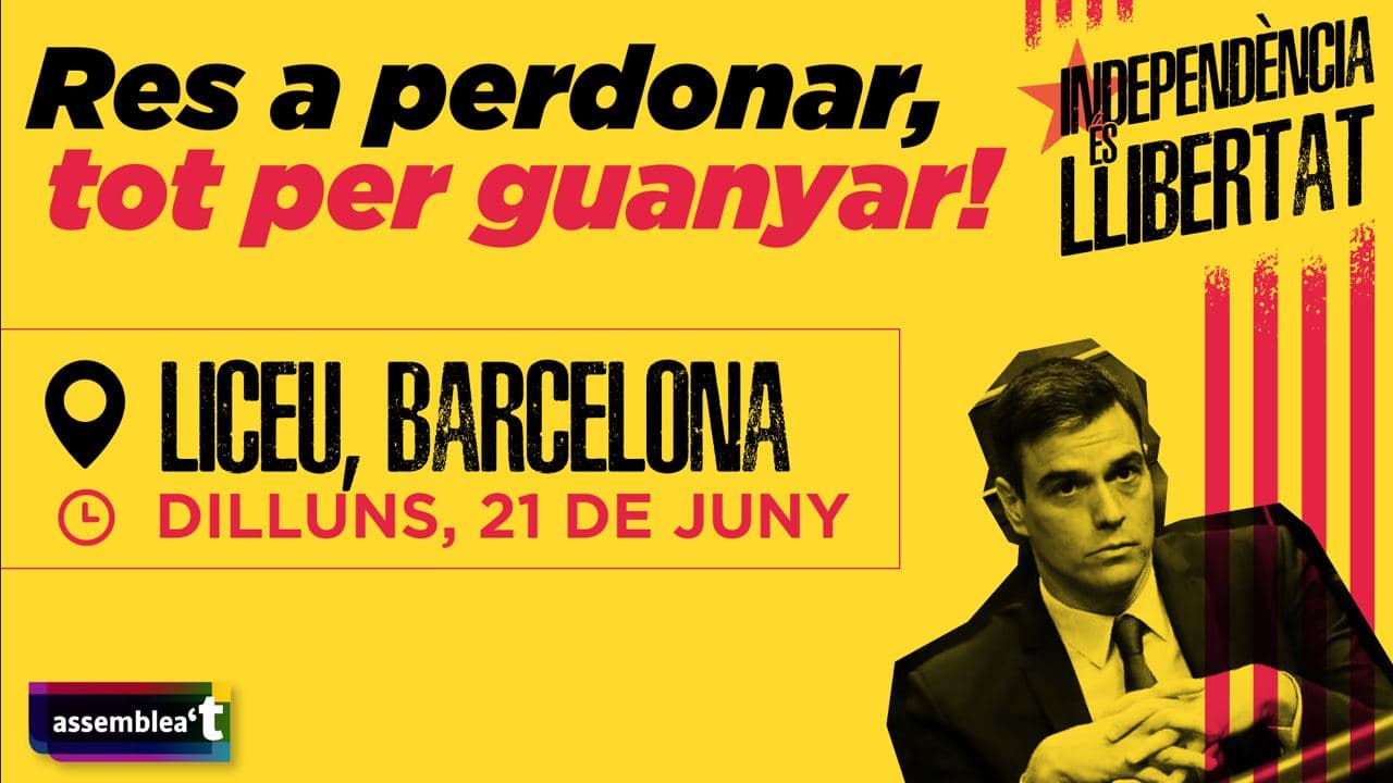 L’Assemblea Nacional Catalana organitzarà un acte polític, dilluns 21 de juny, davant del Teatre del Liceu a Barcelona. Aquest acte coincidirà amb el que durà a terme el govern espanyol per vendre fum amb els indults i el fals relat del “retrobament”.