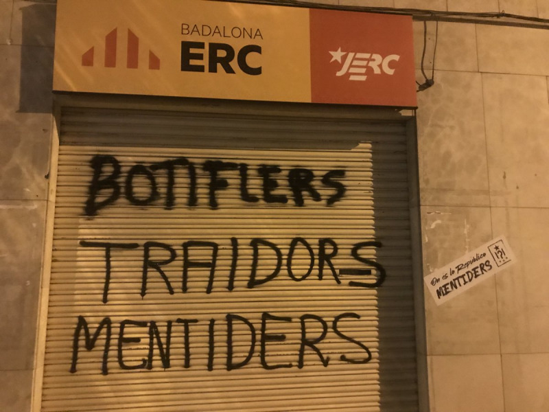 El CDR de Badalona ha reivindicat a través de Twitter unes pintades que han aparegut al local d’ERC al municipi on es poden llegir qualificatius com “botiflers”, “traïdors” i “mentiders”. El comitè ha recriminat als republicans que “vulgui jugar a les cadires i a la pasta”, en referència a la decisió de trencar el seu pacte amb Guanyem per tenir grup propi a l’Ajuntament. “Nosaltres us hem de recordar que el camí cap a la República Catalana es farà amb unitat popular”, ha afegit el CDR, que també ha enganxat a la seu cartells on pregunta: “On esta la república, mentiders?”.
