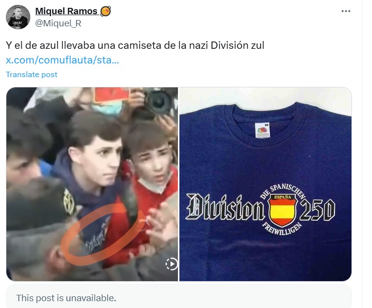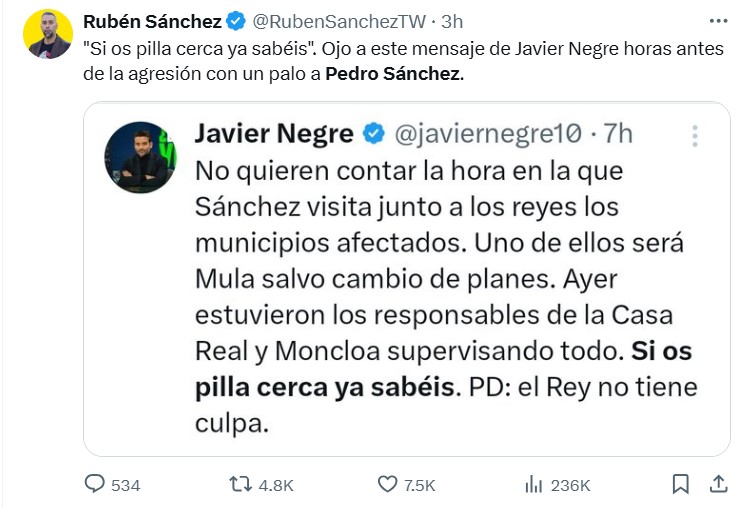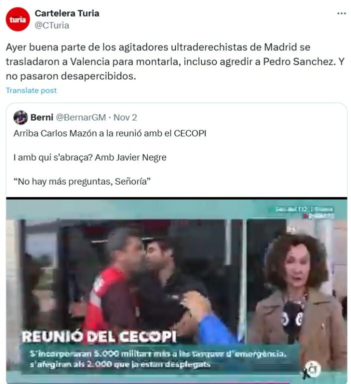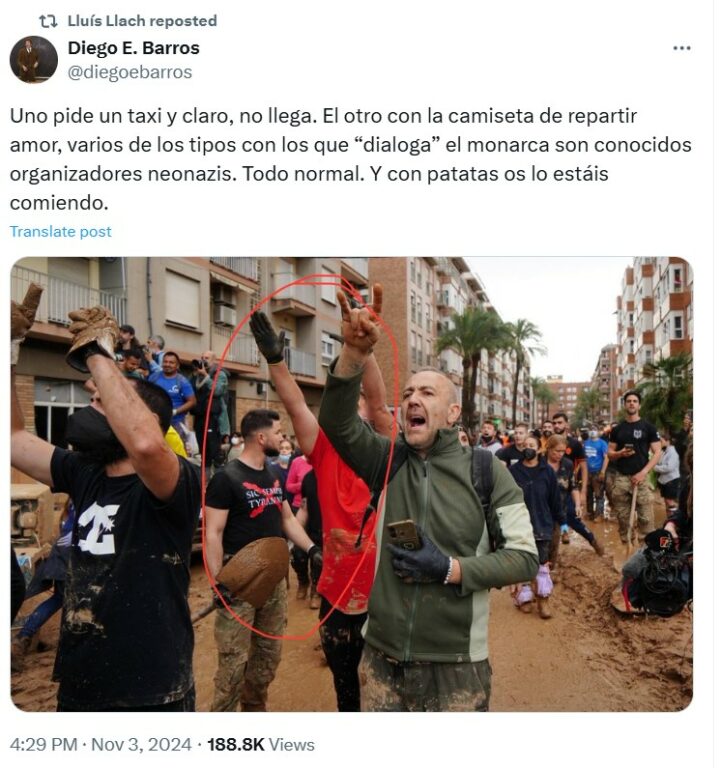 Els detalls d’aquest incident que copsa portades han arribat poca estona després. Segons han assenyalat diversos usuaris i testimonis a través de les xarxes socials, un dels nois amb qui parlava Felip VI és el líder de Revuelta, organització política juvenil d’ultradreta vinculada a Vox. El jove duu una dessuadora blava amb el logotip del grup, i ha pogut parlar amb el rei espanyol sense gairebé cap dificultat, tot i el dispositiu de seguretat del monarca. Altres testimonis també asseguren que membres de Desokupa, una altra organització d’extrema dreta, també s’havien desplaçat al País Valencià. Així mateix, el periodista ultradretà Javier Negre ha publicat hores abans de la visita un missatge en què animava la gent que “estigués a prop” a apropar-se a la visita, de la qual diu que no té informació, tot recordant que “el Rei no té la culpa”.