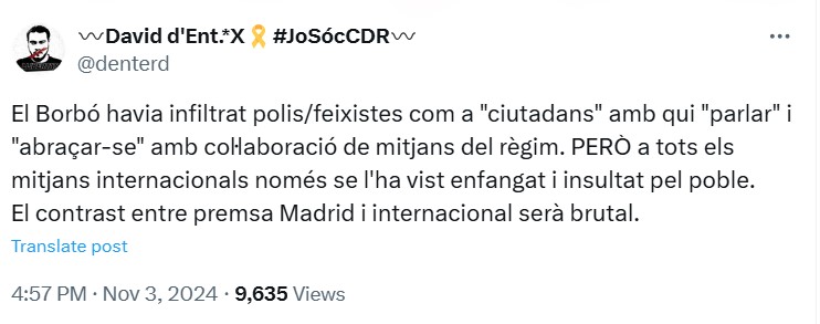 Aquest diumenge, Felip VI, Sánchez i Mazón han estat rebuts amb un bany de fang per part dels veïns i veïnes; una acció de protesta contra la nefasta gestió de la dana que ràpidament ha desembocat en un incident violent. Enmig del llançament del fang, un individu ha colpejat amb un pal d’escombra a Pedro Sánchez, que ha estat evacuat per l’equip de seguretat. El rei espanyol s’ha quedat a parlar amb els veïns enfurismats; Carlos Mazón s’ha assegurat d’estar ben a prop del rei mentre aguantava els insults i les acusacions de negligència dirigides a ell. El cotxe destrossat de Pedro Sánchez ja és una de les imatges més virals del dia, mentre que l’extrema dreta i els mitjans aplaudeixen l’actuació del monarca espanyol destacant-ne que “ha donat la cara”.
