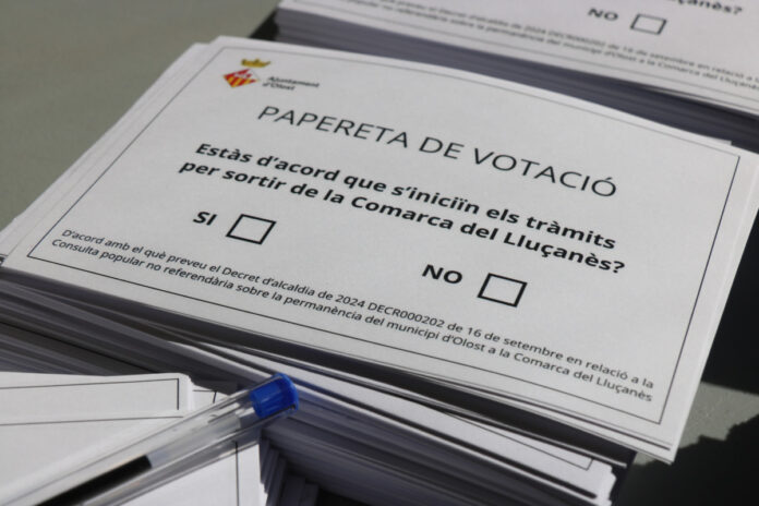 Els veïns d’Olost han decidit deixar el Lluçanès i tornar a Osona. El 52,7% dels participants a la consulta celebrada aquesta setmana i que s’ha clos aquest diumenge han votat a favor d’abandonar la nova comarca, creada fa un any i mig. Han estat concretament 298 persones de les 565 que han participat a la votació. En contra hi han votat 250 olostencs (44,2%), 10 han votat nul i 8 ho han fet en blanc. La consulta, no vinculant, tenia un cens de 1.113 persones i n’ha votat el 50,76%.