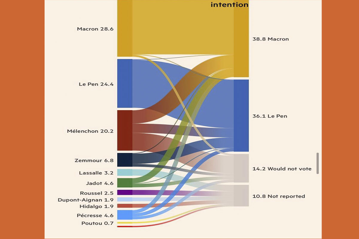 A la primera volta de les eleccions presidencials franceses, Jean-Luc Mélenchon, el candidat d’esquerres, va quedar tercer, i per tan fora de la segona volta, amb un 22% de vots. Macron havia guanyat amb el 27,8 € i, pel mig s’hi va posar Marine Le Pen amb un 23,1%, que serà qui competirà, el diumenge 24 d’abril, amb l’actual president de la República. Amb aquests resultats, immediatament van desfermar-se totes les valoracions i especulacions sobre què farà l’esquerra, en general i els votants de Mélenchon en particular Aquesta notícia s’il·lustra amb la projecció feta pel Financial Times.