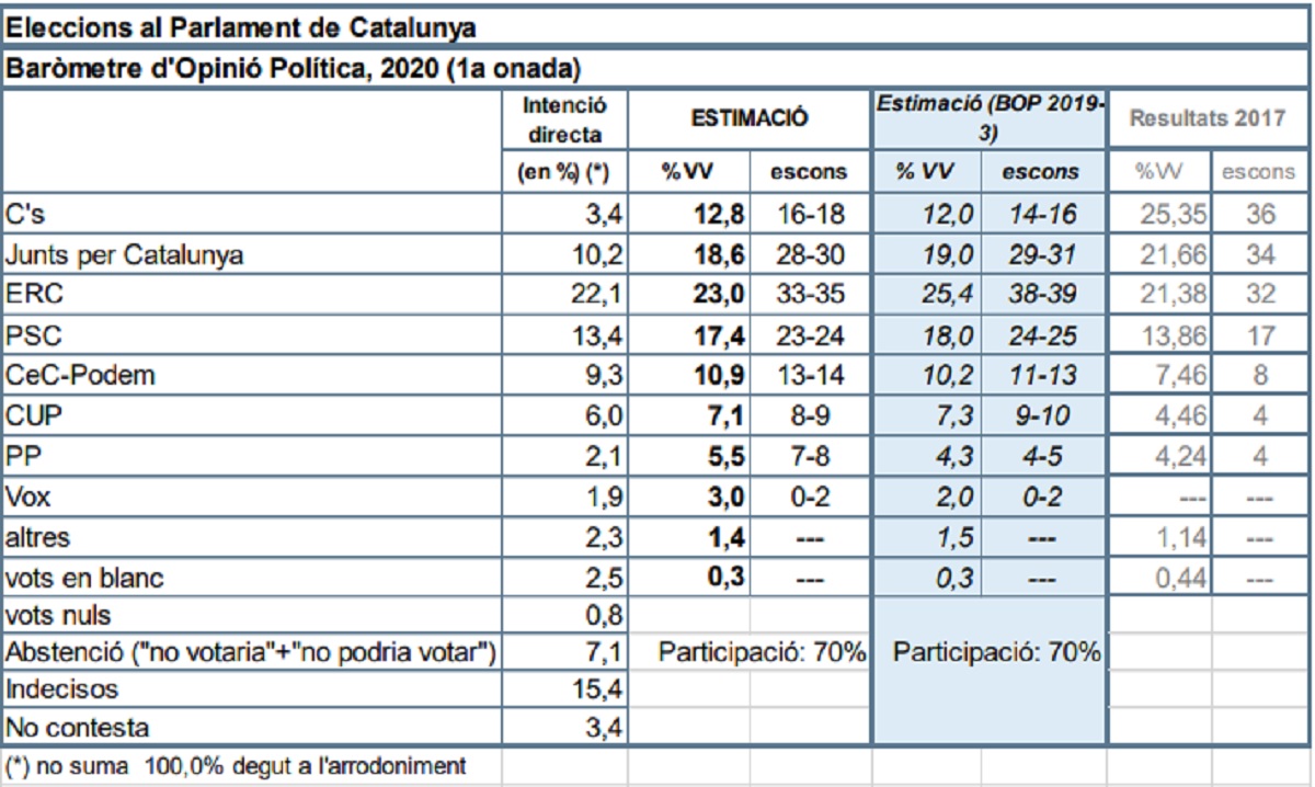 ERC guanyaria les eleccions al Parlament amb entre 33 i 35 escons i l’independentisme podria ampliar l’actual la majoria absoluta a la cambra assolint entre 69 i 74 diputats, segons el baròmetre del Centre d’Estudis d’Opinió (CEO) que s’ha publicat aquest divendres. El CEO pronostica que si se celebressin ara eleccions a Catalunya JxCat seria la segona força amb una forquilla de 28 a 30 diputats, seguida del PSC amb 23 o 24. Cs, que ara és el primer grup de la cambra, passaria a ser el quart amb entre 16 i 18 escons, seguits dels comuns, amb 13 o 14. La CUP obtindria vuit o nou diputats, el PP n’aconseguiria entre set i vuit i Vox podria entrar al Parlament amb un màxim de dos.