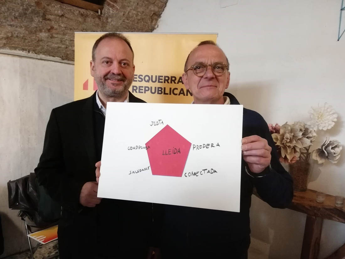 Pueyo ha presentat als mitjans el dibuix d’un pentàgon amb les qüestions de la seva campanya i ha afirmat: “Us vull ensenyar un disseny per al qual he comptat amb la col·laboració de les meves filles, el polígon pentàgon que ens agradaria que definís el programa que presentarem per a una Lleida justa, compromesa, saludable, connectada i propera”.