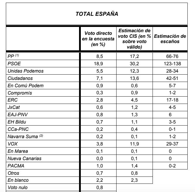 El Centro de Estudios Sociológicas, el CIS, ha publicat avui una enquesta amb la intenció de vot a les eleccions espanyoles d’aquest 28 d’abril.