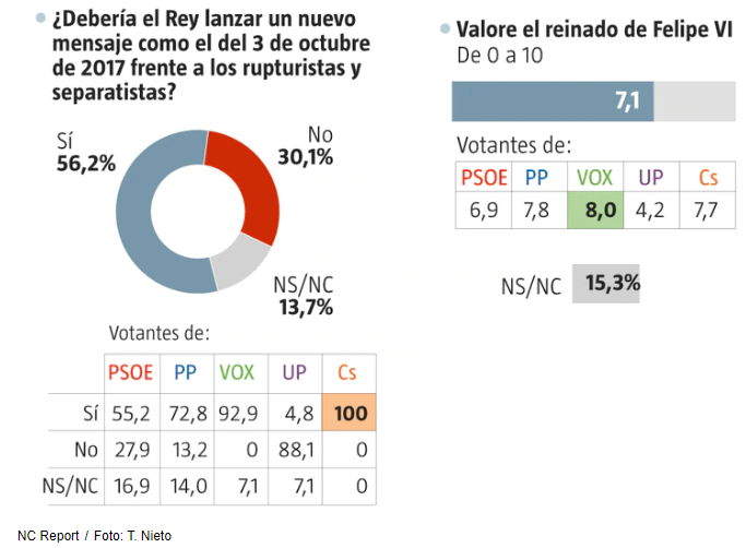 La mateixa enquesta demana una valoració als espanyols sobre el regnat de Felipe VI i el resultat és aclaparador: un notable amb un 7,1 de nota sobre 10.