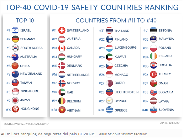 El Marc de Rànquing de Seguretat COVID-19 realitza comparatives per determinar els nivells de seguretat i salut de cada país durant la pandèmia. Les dades de més de 200 països es van analitzar i seixanta països van ser finalment inclosos en el rànquing. Es van avaluar els països mitjançant 24 paràmetres específics en 4 categories diferenciades: eficiència en quarantena, eficiència en gestió de govern, supervisió i detecció i preparació per al tractament d’emergències. Els rànquings de seguretat i risc tenen en compte la protecció contra la infecció per COVID, la mortalitat i els resultats negatius dels pacients, les mètriques sobre la quarantena i el control, la detecció i la gestió de la infecció i la seguretat i l’estabilitat en el sentit més ampli, inclosa la protecció contra resultats negatius extrems com a resultat de la pandèmia més enllà de la salut. Els països que no són capaços de neutralitzar aquesta pandèmia podrien desencadenar una cadena d’esdeveniments amb resultats negatius. Espanya no hi surt: