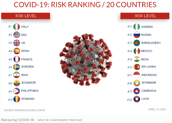 El Marc de Rànquing de Risc COVID-19 realitza el control comparatiu de països segons els seus nivells de risc segons una varietat de factors mèdics i no mèdics, inclosos el risc d’infecció, hospitalització, mort i condicions de salut duradores, així com el risc negatiu del país, qüestions econòmiques, de qualitat de vida i geopolítiques derivades de la pandèmia. El marc inclou 24 paràmetres agrupats en 4 grans categories: Risc propagat per infeccions, gestió governamental, eficiència assistencial i riscos específics regionals. Espanya és la quarta: