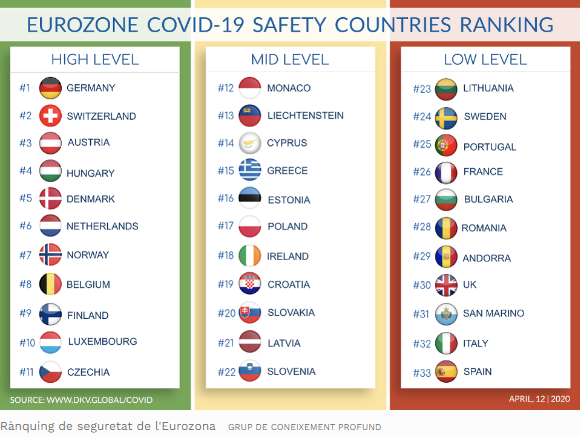 El marc de classificació de seguretat / risc de la zona euro COVID-19 ha estat dissenyat específicament per a les circumstàncies úniques presents a Europa. Es va aplicar una atenció especial a les característiques úniques d’Europa, incloses economies altament interconnectades, alts nivells de subministrament, flux turístic i incidència i punts calents crítics. Espanya es troba en l’última posició: