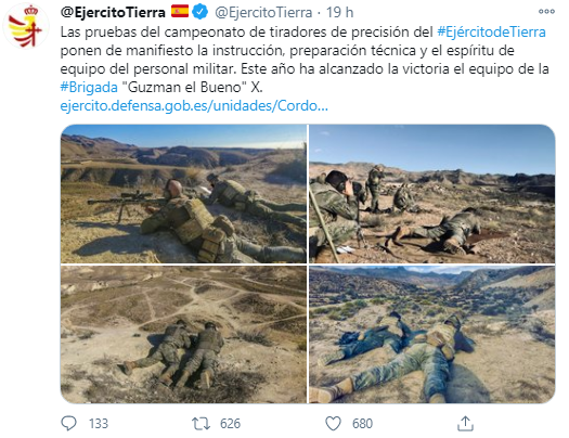 El perfil oficial de l’Ejército de Tierra de l’Armada Española publicava un tuit amb unes fotos on es podien veure uns soldats encanyonant uns rifles. Segons el text, es tractava de “les proves del campionat de tiradors de precisió de l’Ejército de Tierra”. Una espècie de competició interna on expliquen que “aquest any ha arribat a la victòria l’equip de la Brigada “Guzman el Bo” X”.