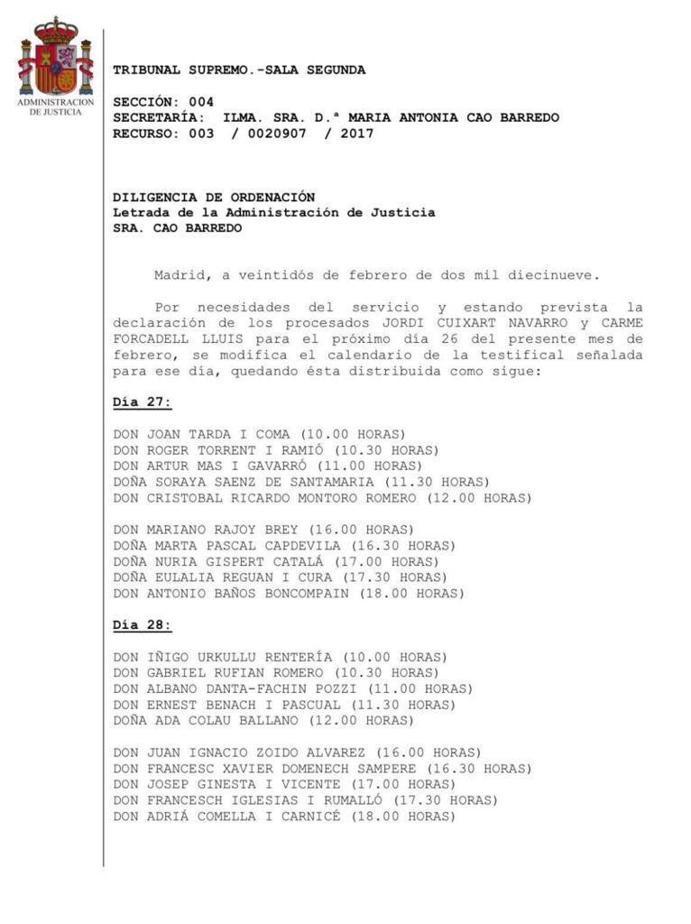 La gran quantitat de gent que ha de passar pel Tribunal Suprem a declarar és tan gran que les preses de Manuel Marchena, jutge que presideix la Sala, han fet que només doni 30 minuts per persona. Això inclou les preguntes de les acusacions i també les de les defenses.