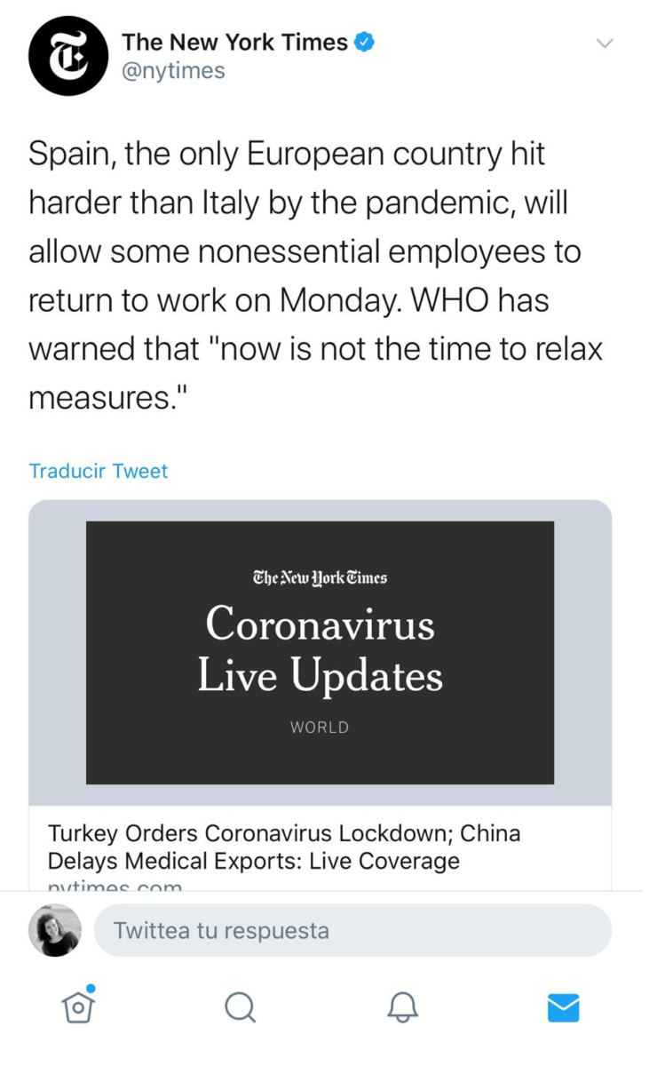 Una decisió que ha sorprès la premsa internacional com el prestigiós The New York Times que ha dedicat tot un article a les decisions de l’executiu de Pedro Sánchez. “Espanya, l’únic país europeu més afectat que Itàlia per la pandèmia, permetrà que alguns empleats no essencials puguin tornar a treballar dilluns” s’escandalitza el diari que, a més, recorda la posició de l’Organització Mundial de la Salut que ha advertit que “ara no és el moment de relaxar les mesures”.
