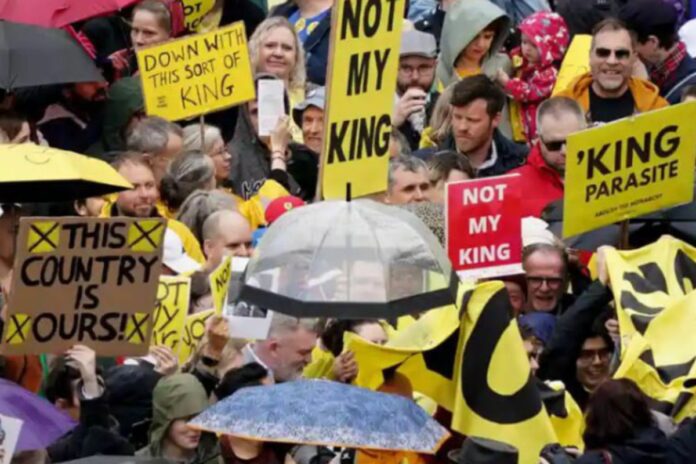 Una de les protestes antimonàrquiques que més atenció havia rebut era, precisament, la convocada per Republic a la plaça Trafalgar. El líder del grup, Graham Smith, i cinc voluntaris més, van ser detinguts una hora abans que la protesta comencés, quan tots sis descarregaven pancartes i cartells d’un cotxe per repartir entre els protestants a la plaça. Malgrat la detenció de Graham, la protesta encara va reunir prop de 2.000 persones, que van onejar banderes grogues mentre el rei i la processó es dirigien al palau de Buckingham. Tot i que no van produir-se incidents alarmants, finalment la policia britànica ha confirmat que va detenir un total de 52 persones durant la coronació, la majoria d’elles per provocar “disturbis” i “interrompre la pau”.