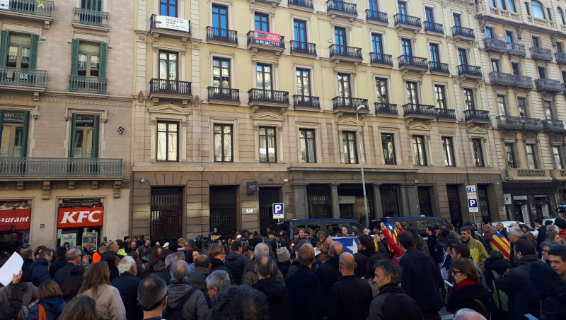 Els concentrats han tallat la Ronda Universitat, a l’altura de Rambla Catalunya, on se situa el consolat, custodiat per dos furgons dels Mossos d’Esquadra i una desena d’agents a la vorera.
