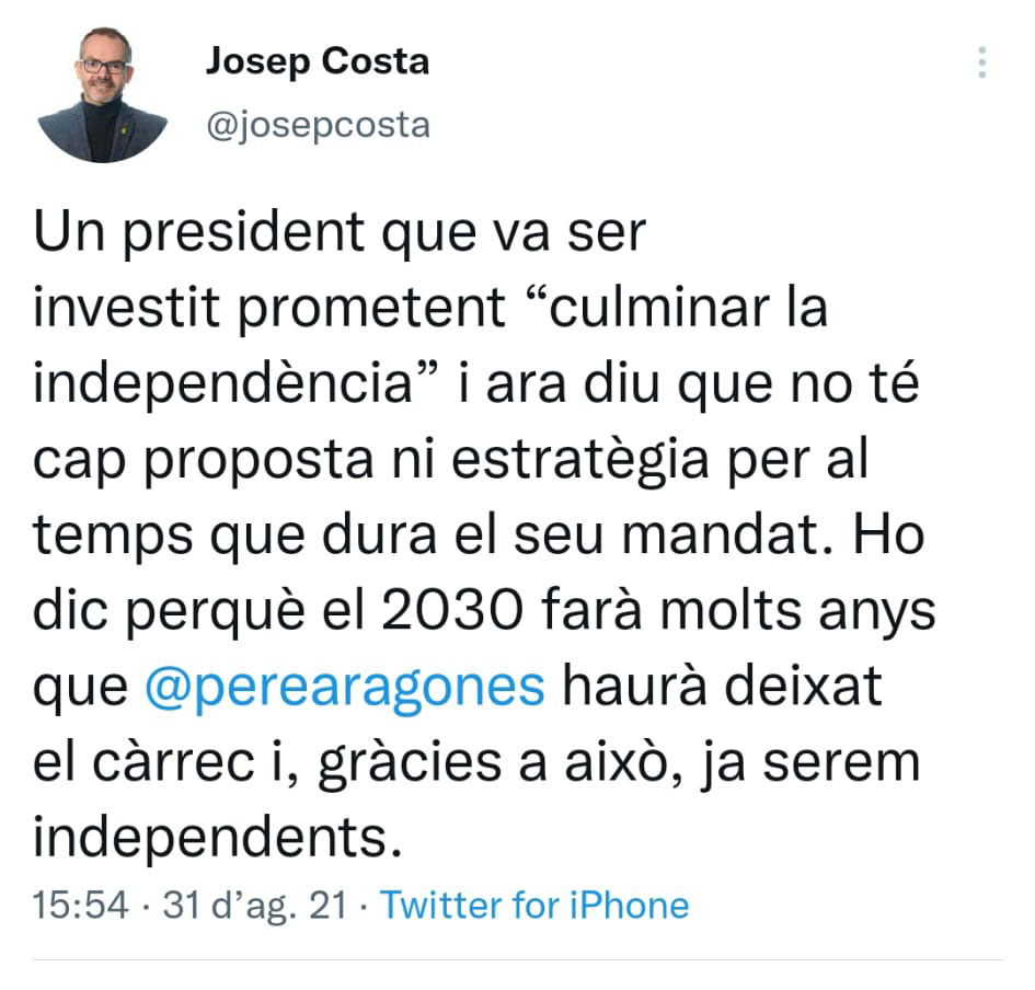 Una cosa és rebaixar una mica la idea del “tenim pressa”, idea enarborada per ERC en els anys previs a l’1-0 del 17, i una altra xutar la pilota endavant cap al 2030 en una casual coincidència amb l’embrió dels hipotètics Jocs Olímpics d’hivern al Pirineu. Efectivament, la data del 2030 l’ha assenyalat el MHP Aragonès com a factible per al “referèndum pactat”. Per un cantó, això ha sigut suficient perquè l’estat ja hagi respost que “parlar de data per a la independència no és el camí” i que el PP de Casado ja hagi acusat Pedro Sánchez de traïdoria per no tallar de soca-rel aquesta pretensió. Per l’altre, si els dos anys de marge de la taula de diàleg a alguns els sembla etern, què no han de pensar davant d’un lapse de nou anys?. Al final tindrà raó en Deulofeu que va predir la independència de Catalunya per al 2029. Mirem què en pensa qui va ser vicepresident del parlament, en Josep Costa: