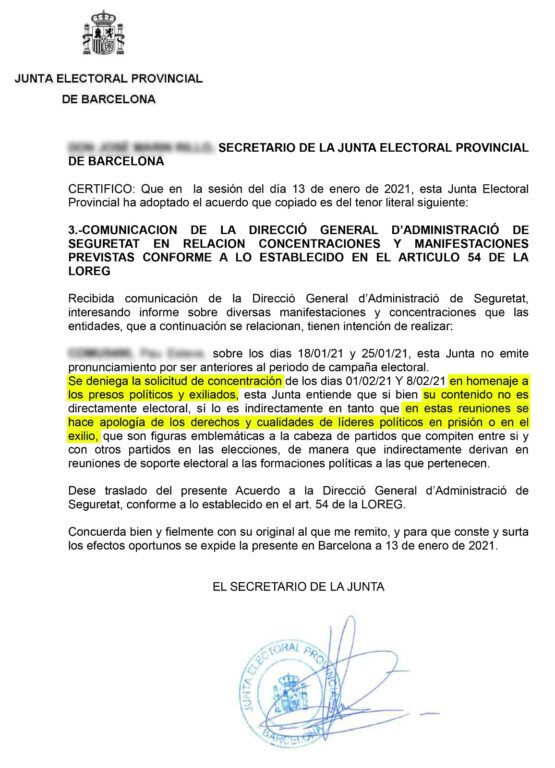 La Junta Electoral Provincial de Barcelona ha decretat que durant el període electoral queden prohibides les reunions o manifestacions en suport als presos polítics o de reclam de la seva llibertat. En un comunicat, la Junta especifica que “si bé el seu contingut no és directament electoral, sí que ho és indirectament amb el benentès que en aquestes reunions s’hi faci apologia dels drets i qualitats de líders polítics a la presó o a l’exili”.