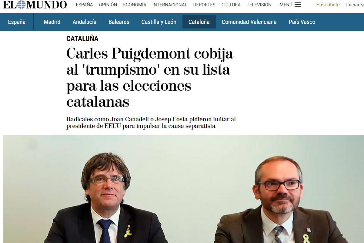 Els mitjans espanyols aprofiten qualsevol excusa per vincular Puigdemont amb l’ideologia extremista de Donald Trump, i a alguns ja comença a pujar-los la mosca al nas. El Mundo ha aprofitat l’assalt al Capitoli dels EUA per titular que el president exiliat inclou “trumpistes” a les llistes del 14-F, i fins i tot en diu els noms: Joan Canadell i Josep Costa. Però l’assessor del president exiliat a les xarxes socials, Aleix Clarió ja va tuitar que aquest “relat infantil”, no l’han creat a partir del caos als Estats Units, sinó que “fa mesos que l’estan fent circular”, posant exemples de d’alguns diaris que asseguraven que Puigdemont utilitzava “estratègies trumpistes”.