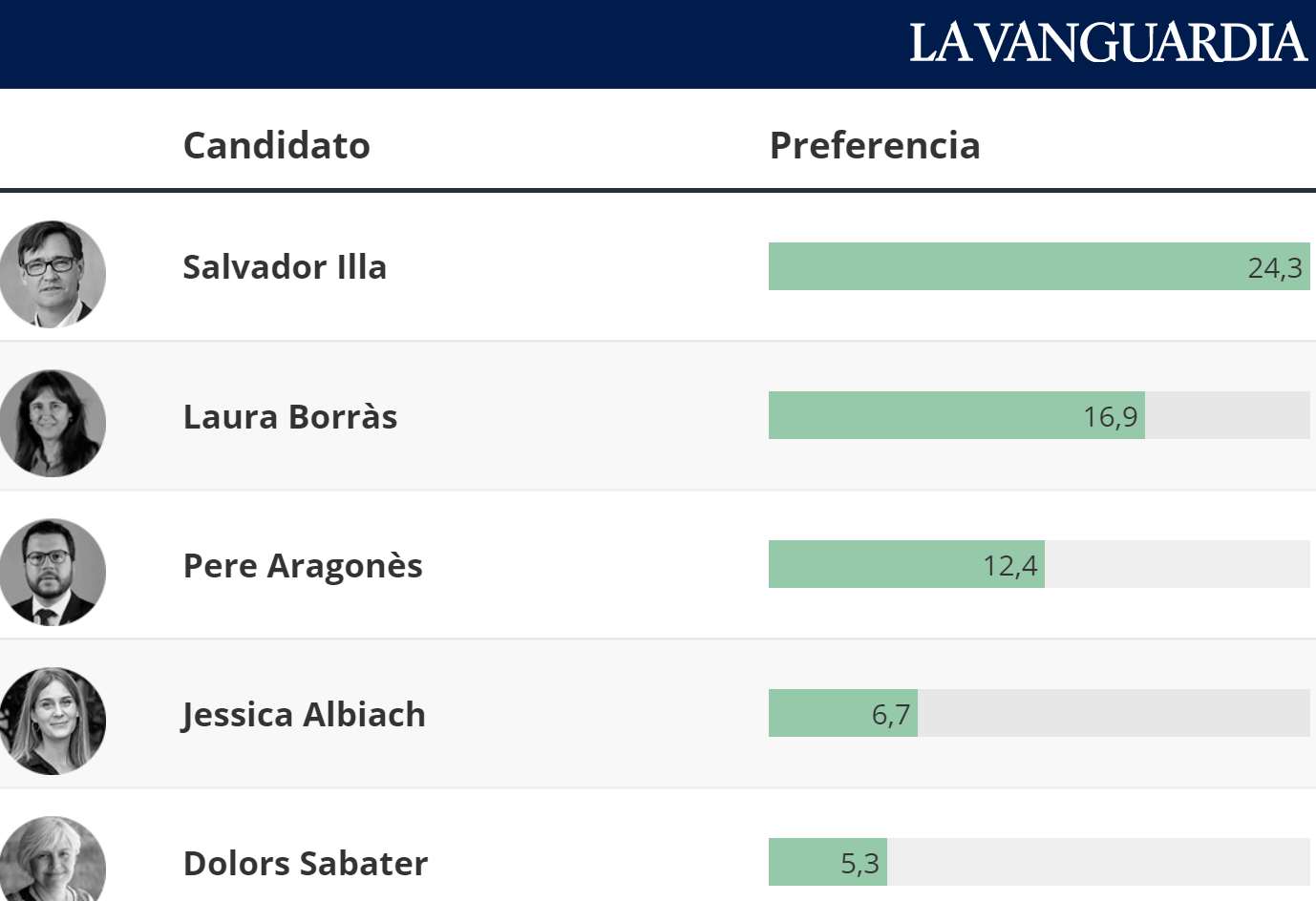 Segons el sondeig que ha recollit Europa Press, Illa és el candidat favorit del 24,3% dels enquestats, mentre que Borràs ho és del 16,9% i el candidat d’ERC i actual vicepresident del Govern, Pere Aragonès, és qui prefereix un 12,4%.