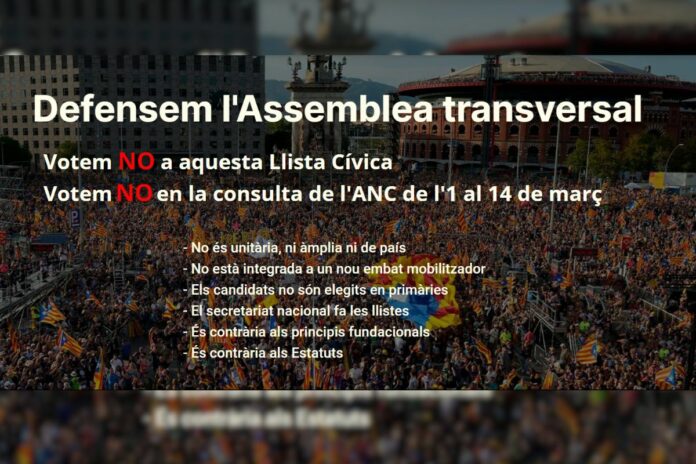 La proposta de la direcció de l’Assemblea Nacional Catalana (ANC) de presentar-se a les pròximes eleccions presidencials amb una llista cívica continua provocant incendis en el si de l’entitat. Més de 130 persones properes a l’entitat, entre elles càrrecs, persones fundadores, membres del Secretariat Nacional o dels secretariats d’Assemblees Base han signat, a títol personal, un manifest contrari a la llista cívica, tot denunciant l’opacitat de la direcció i la manca de democràcia interna de l’entitat. A la vegada, han presentat el decàleg pel ‘No’ a la llista cívica.